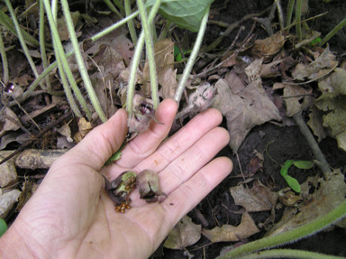 Seed collection: Wild ginger seed is produced in a small fleshy fruit. Each fruit contains two to three dozen seeds. The fruit lies close to the ground and is usually hidden by the leaves and leaf litter. Lift up the leaves at the end of the plant and the fruits will be more visible. Crush a few fruits to check on seed ripeness. Collect the fruits when the seeds change from green to brown. Seed matures in late May in western New York. If the fruits are left too long they begin to decay and fall apart making collecting difficult.